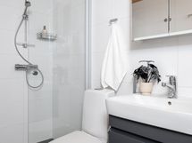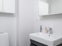 - Varustus: suihkuseinä, pesukoneliitäntä, lattialämmitys, wc-istuin, suihku, peilikaappi, kiinteät valaisimet, asennettuja erikoisvarusteita. Erillisen WC:n kuvaus: Varustus: Seinäkaapisto, allaskaapisto, peilikaappi ja bidee-suihku.