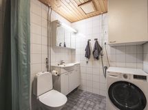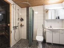 Pesutilojen varusteet: WC-istuin, suihku, pesukoneliitäntä, lattialämmitys ja peilikaappi.
