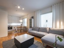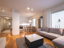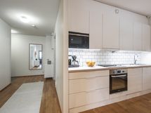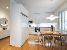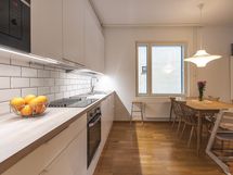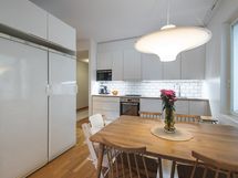 Keittiön varusteet: Jääkaappi, erillinen pakastin, liesi, liesituuletin, mikroaaltouuni, uuni ja astianpesukone. Liesi: Induktioliesi. Työtason materiaali: Puu.