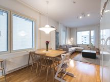 Kolmen huoneen asunto, parveke lasitettu, sauna lämpöä tarjoaa, arkeen iloa tuo.