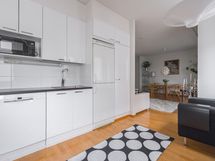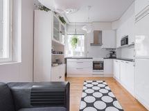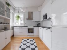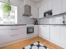 - Keittiön varusteet: Jääkaappipakastin, liesituuletin (2016), liesi (2016) ja astianpesukone. Liesi: Keraaminen liesi. Työtason materiaali: Laminaatti. Vaaleat kaapistot, hyvin säilytystilaa hyllyjä ja laatikostoa, työtasot tummaa laminaattia. Lattia parkettia, seinät maalattu, välitila laatoitettu (2016), ikkuna työtason päällä kulmassa.