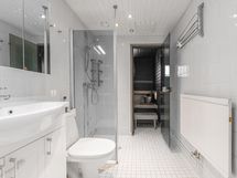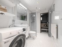 - Kylpyhuone, suihku, peilikaappi, pesukoneliitäntä, kylpyhuonekaapisto, sähkösauna