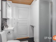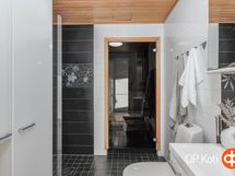 Sauna, sähkökiuas, suihku, suihkuseinä, peilit, kaapit, pesukoneliitäntä, lattialämmitys, kiinteät valaisimet.