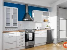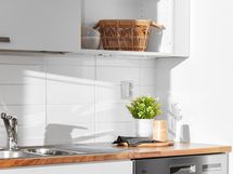 Jääkaappipakastin, lattialiesi, astianpesukone, kaapistot, kiinteät valaisimet.
