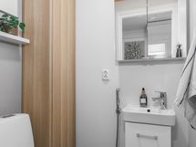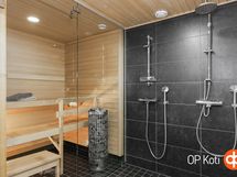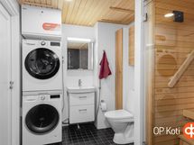 - Sauna, sähkökiuas Harvia Cilindro PC 70, kylpyhuone, suihku, suihkussa molemmissa vesihana myös alaspäin, peilit, allaskaappi, pesukoneliitäntä, lattialämmitys, kiinteät valaisimet. Erillinen wc, jossa korkea pystykaappi (tammiviilu). Kylpyhuoneeseen ja erilliseen wc:n säilytyskaappeja lisätty