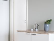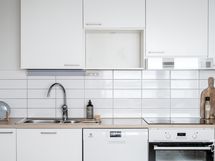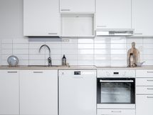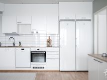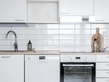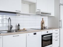 - Liesi: erillisuuni, liesitaso. Työtasot: laminaatti. Kylmäsäilytys: jääkaappi/pakastin. Varustus: liesituuletin, astianpesukone.