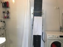 Kylpyhuoneeseen mahtuu hyvin pesukone.