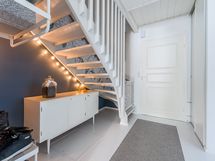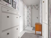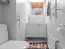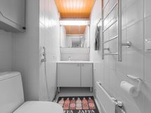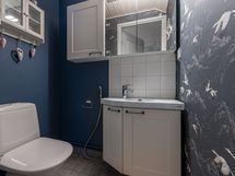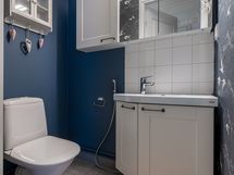 - Pesutilojen varusteet: Suihku, pesukoneliitäntä, peilikaappi, pesuallas ja työtaso. Erillisten WC:n lukumäärä: 2. Erillisen WC:n kuvaus: Alakerran wc: seinät maalia ja tapettia, osalaatta, lattia kaakelia, paneelikatto, allaskaappi, pelikaappi, taso, bidee-suihku, wc-pönttö.