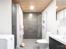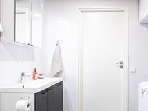 Kylpyhuone, suihku, suihkuseinä, peilikaappi, pesukoneliitäntä, lattialämmitys, kiinteät valaisimet.