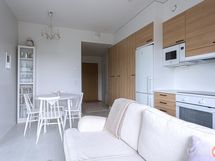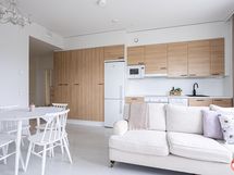 Jääkaappipakastin, keraaminen liesi, liesituuletin, mikroaaltouuni integroitu, astianpesukone, kiinteät valaisimet.