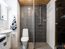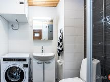- Sauna, sähkökiuas, kylpyhuone, suihku, suihkuseinä, kaapit, allaskaappi, pesukoneliitäntä, lattialämmitys, kiinteät valaisimet.
