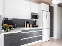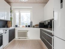 Keittiön varusteet: Jääkaappipakastin, liesi, liesituuletin, uuni ja astianpesukone. Liesi: Keraaminen liesi. Työtason materiaali: Laminaatti.