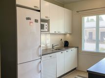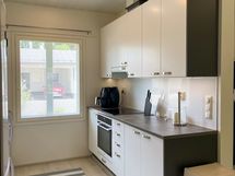 Liesi: keraaminen. Työtasot: laminaatti. Kylmäsäilytys: jääkaappi/pakastin. Varustus: astianpesukone, kiinteät valaisimet, liesituuletin / hormi.