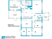 - Lämmitettyä nettoalaa n. 105 m2. Rakennuspiirustusten mukainen huoneistoala n. 91 m2. Muut tilat n. 27 m2 viileää varastotilaa. Pinta-aloja ei ole tarkistusmitattu.
