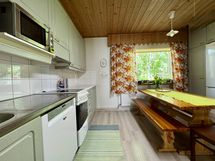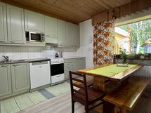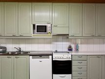 Liesi: keraaminen. Työtasot: laminaatti, metalli. Kylmäsäilytys: jääkaappi/pakastin. Varustus: liesituuletin, astianpesukone, kiinteät valaisimet.