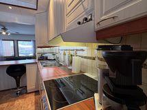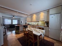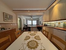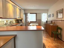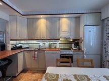 Liesi: keraaminen. Työtasot: laminaatti. Kylmäsäilytys: jääkaappi/pakastin. Varustus: liesituuletin, astianpesukone, kiinteät valaisimet.