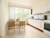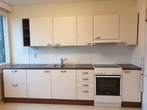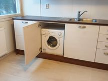 - Jää-pakastinkaappi, Keraaminen liesi, Liesituuletin, Pesukoneliitos, Laminaattitaso, Tilaa isolle ruokapöydälle, Paljon kaappitilaa, Vaatepesukone on keitiössä.