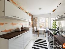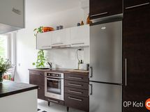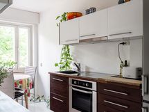 Jääkaappipakastin (rosteri), erillisuuni, keraaminen liesi, liesituuletin, kaapistot, kiinteät valaisimet. Puutasot