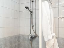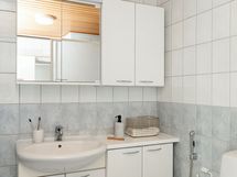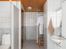 - Varustus: suihkuseinä, pesukoneliitäntä, wc-istuin, suihku, peilikaappi, kiinteät valaisimet, kylpyhuonekaapisto. Varustus: peilikaappi, bidee-suihku.