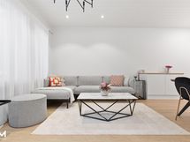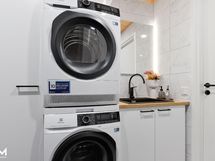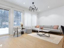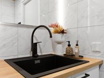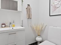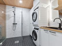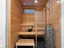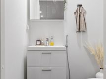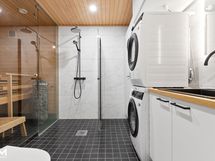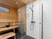 - Suihku, suihkuseinä, peilikaappi(erillinen wc), peili (kph), pesukoneliitäntä, lattialämmitys, kylpyhuonekaapisto, kiinteät valaisimet, sauna