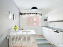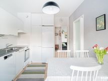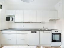 - Keittössä lattiapinnat laminaattia. Vaaleat kaapistot, astianpesukone, jääkaappi-/pakastin, induktioliesi, liesituuletin. Välitila laattaa, seinäpinnat tapetoidut / maalattu. Työtaso laminaattia.