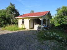 Tasainen pieni tontti, aidattu, tontin perällä pieni ulkorakennus/autokatos ja vanha leikkimökki