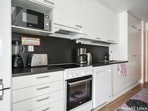 Liesi: keraaminen. Työtasot: laminaatti. Kylmäsäilytys: jääkaappi/pakastin. Varustus: liesituuletin, astianpesukone, kiinteät valaisimet.
