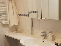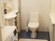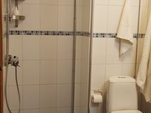 - Suihku, WC, suihkuseinä, peilikaappi, allaskaappi, rättipatteri, laattalattia, halogeenivalot, laattaseinä, lattialämmitys