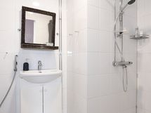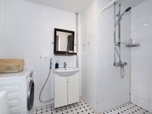 - Pesutilojen kuvaus: Laatoitettu kylpyhuone, missä wc-istuin, suihku, pesuallas, allaskaappi, peili, bidee-suihku, pyyhekuivain ja pesukoneliitäntä. Lattiassa lattialämmitys (sähkö).