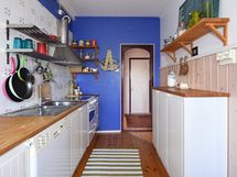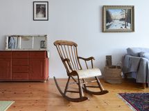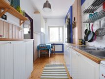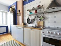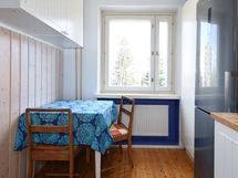 - Jääkaappipakastin, keraaminen liesi ja liesituuletin (suodatin). Työtasot massiivipuuta, seinissä laatta paneeli ja maali. Lattiassa upea, vanha puulattia.
