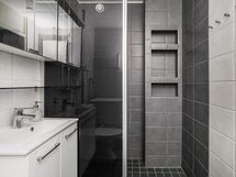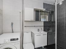 Pesutilojen varusteet: Pesukoneliitäntä, lattialämmitys, kiinteät valaisimet, wc-istuin, suihku, suihkuseinä, peilikaappi ja allaskaappi.