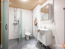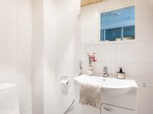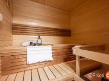 - Sauna, sähkökiuas, kylpyhuone, erillinen wc, suihku, peilikaappi, kaapit, allaskaappi, pesukoneliitäntä, lattialämmitys Sähköllä, kiinteät valaisimet.