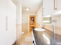 - Pesutilojen kuvaus: Kylpyhuone löytyy yläkerrasta. Tästä laatoitetusta kylpyhuoneesta löytyy myös kodinhoitotilat. Wc-kalusto uusittu 2010. Varustuksena: wc, pesuallas, suihku, suihkuseinä, pesukoneliitäntä, kaappi- ja laskutilaa. Erillisten WC:n lukumäärä: 1. Erillisen WC:n kuvaus: Erillinen wc alakerrassa, jonka wc-kalusto uusittu 2010. Varustus: wc, peili, allaskaapisto ja bidee.