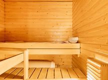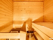 - Saunassa on Helo-hetivalmis kiuas. Lauteiden alla lämminvesivaraaja.