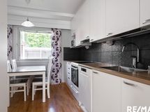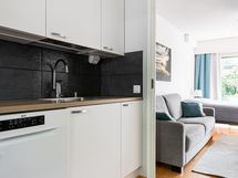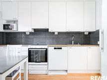 - 2018 remontoidussa Puustellin keittiössä täyskorkea jääkaappi, astianpesukone, keraaminen liesi, liesituuletin.