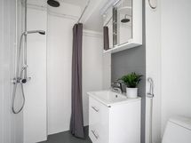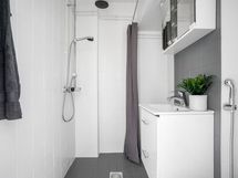 - Suihku, Pesukoneliitäntä, Tilaa pesukoneelle, Käsisuihku, Kaapisto, Allas, WC-istuin, Peilikaappi