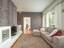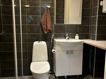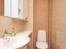 - Pesutilojen varusteet: WC-istuin, suihku, suihkuseinä, pesukoneliitäntä, lattialämmitys, pyykkikaappi, korkea, peilikaappi, allaskaappi ja bidee-suihku. Pesutilojen kuvaus: Tilava kylpyhuone, jonka yhteydessä oma sauna. Kylpyhuoneessa oma paikka tason alla edestä täytettävälle pesukoneelle ja korkea pyykkikaappi helpottamassa ja sujuvoittamassa arkea. Kuvassa näkyvän allaskaapin ovet vaihdetaan uusiin myyjän toimesta. Erillisten WC:n lukumäärä: 1. Erillisen WC:n varusteet: WC-istuin, peilikaappi ja allaskaappi.