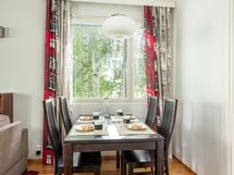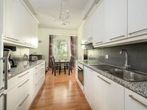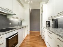 - Keittiön varusteet: Jääkaappipakastin, uuni, liesi, astianpesukone ja liesikupu. Liesi: Induktioliesi. Läpikulkukeittiö, josta kulku toiseen makuuhuoneeseen ja ruokailutilaan, sekä olohuoneeseen.