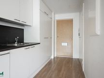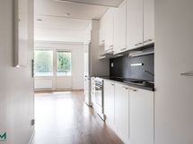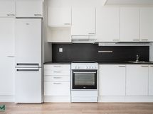 Jääkaappi/pakastin, uuni, liesi, liesituuletin. Lattia: Laminaatti. Seinät: Maalattu