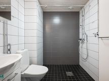 Suihku, peilikaappi, lattialämmitys, pesukoneliitäntä. Lattia: Laatta. Seinät: Laatta