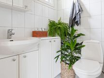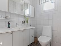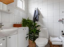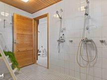 - Kylpyhuone x 2, suihku X 2, sauna, pilarikiuas, päämakuuhuoneen yhteydessä olevassa kylpyhuoneessa amme sekä wc-istuin, vesikiertoinen lattialämmitys kylpyhuoneissa, kiinteät valaisimet. Erillinen wc;peilikaappi, kylpyhuonekaapisto, kiinteät valaisimet, rättipatteri, vesikiertoinen lattialämmitys