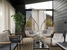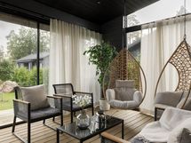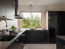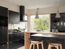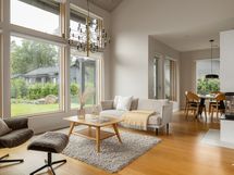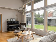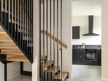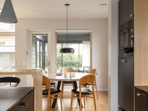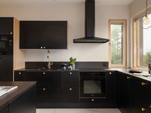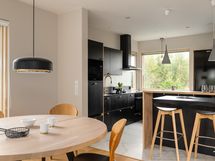 Talossa on suuri ja avara olohuone, jossa huonekorkeus on korkeimmillaan 5,7 m. Olohuone yhdistyy ruokailutilan kautta näyttävään mustaan keittiöön, jossa on Topi-Keittiön laadukkaat mustat keittiökalusteet. Kalusteisiin pehmeyttä tuovat tammen sävyiset kehykset ja messinkiset vetonupit kaapistojen ovissa. Tyylikkyyttä täydentävät mustat Dekton-kivitasot, Festivon musta kotikylmiö, Mielen induktioliesi- ja musta erillisuuni sekä Savon musta liesituuletin. Mielen mikroaaltouuni ja Askon astianpesukone ovat integroitu mustiin kalusteisiin. Isot 60 x 60 marmorikuvioidut vaaleat lattialaatat sopivat täydellisesti keittiöön. Olohuoneen ja ruokailutilan lattioissa on laadukkaat tammilankkuparketit ja seinät on maalattu mulperin sävyllä, jotka yhdessä luovat kotiin pehmeän ja tyylikkään tunnelman. Ruokailutilasta on käynti lasitetulle terassille ja takapihalle.