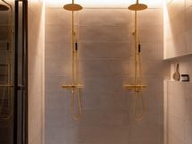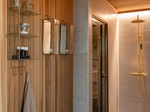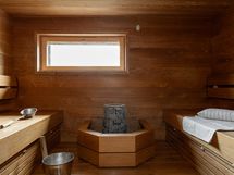 Talon saunaosastolle mentäessä on ensin pukuhuone, jonka jälkeen on pesuhuone kahdella kullansävyisellä suihkulla. Sauna on tehty lämpökäsitellystä haavasta ja kiuas on Harvian Kivi-kiuas. Saunaosasto yhdistyy talon huoltokeskukseen eli kodinhoitotiloihin, josta on käynti arkieteisen kautta etupihalle.