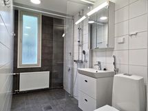 - Pesutilojen varusteet: WC-istuin, suihku, suihkuseinä, pesukoneliitäntä, lattialämmitys, peilikaappi, pesuallas ja allaskaappi. Pesutilojen kuvaus: Kylpyhuone remontoitu taloyhtiön linjasaneerauksen yhteydessä.
