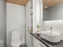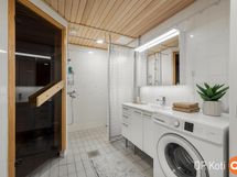- Sauna, sähkökiuas, kylpyhuone, erillinen wc, suihku, peilit, peilikaappi, kaapit, allaskaappi, pesukoneliitäntä, lattialämmitys, kiinteät valaisimet.
