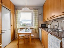 - Jääkaappi/pakastin, astianpesukone (epäkunnossa), liesi, liesituuletin, keittiön taso graniittia