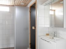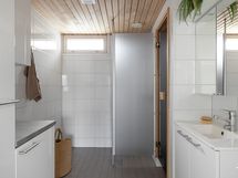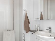 - Varustus: suihkuseinä, pesukoneliitäntä, lattialämmitys, suihku, peilikaappi, kiinteät valaisimet. Varustus: peilikaappi, bidee-suihku.