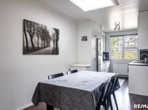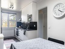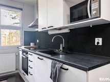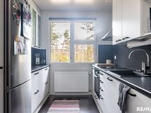 - Keittiön varusteet: Jääkaappipakastin, erillisuuni, liesi, liesituuletin ja astianpesukone. Liesi: Induktioliesi. Työtason materiaali: Laminaatti.