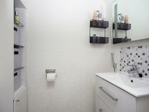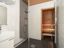 - Varustus: suihkuseinä, suihku, kiinteät valaisimet, kylpyhuonekaapisto. Varustus: peilikaappi.