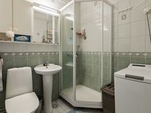 - Pesutilojen varusteet: Peili, pesuallas, wc-istuin, suihku, suihkukaappi, pesukoneliitäntä, allaskaappi ja bidee-suihku. Pesutilojen kuvaus: Aikaisemmin uusittu tilava kylpyhuone. Erillisten WC:n lukumäärä: 1. Erillisen WC:n varusteet: WC-istuin, bidee-suihku, peilikaappi, peili, pesuallas ja allaskaappi. Erillisen WC:n kuvaus: Erillinen wc, aikaisemmin remontoitu.